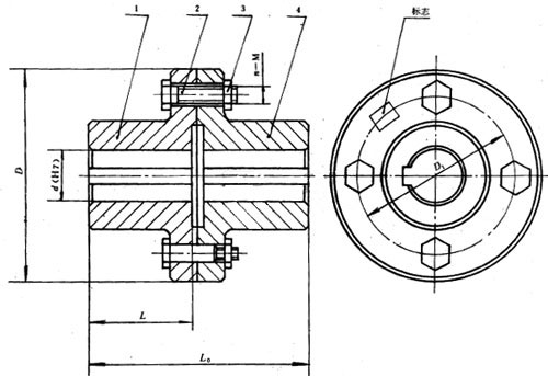 許用轉速[n]r/min | 軸孔直徑d(H7) | 軸孔長度L | D | D1 | 螺栓 | L0 |